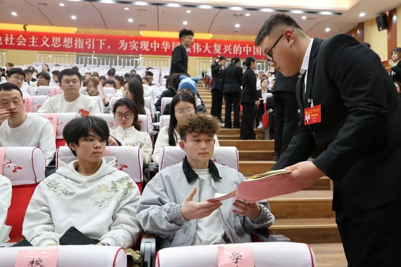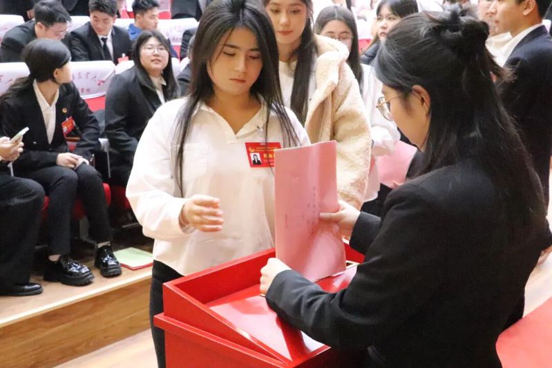 会议进入候选人竞选环节。农学院学工办主任古丽那扎尔·外力宣读候选人选举办法;农学院团委书记王铜宣读总监票人、监票人、计票人名单,随后工作人员向学生代表发放选票。