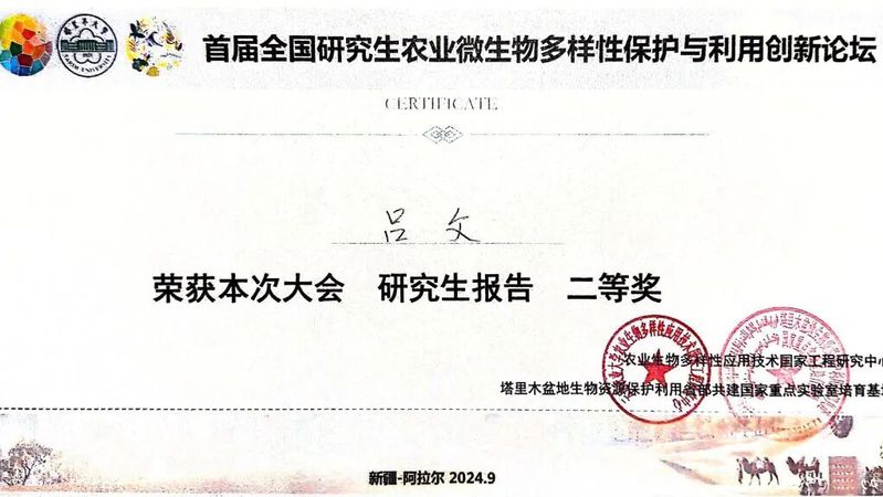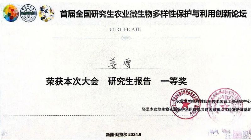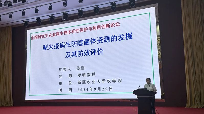 2024年9月28-29日,新疆农业大学农学院罗明教授和韩剑副教授团队硕士研究生姜雪和吕文同学在“首届全国研究生农业微生物多样性保护与利用创新论坛”会议中,分别做题为“梨火疫病生防噬菌体资源的发掘及其防效评价”和“捕食性黏细菌在梨火疫病生物防治中的研究与应用”的学术报告,分获论坛优秀报告一等奖和二等奖。