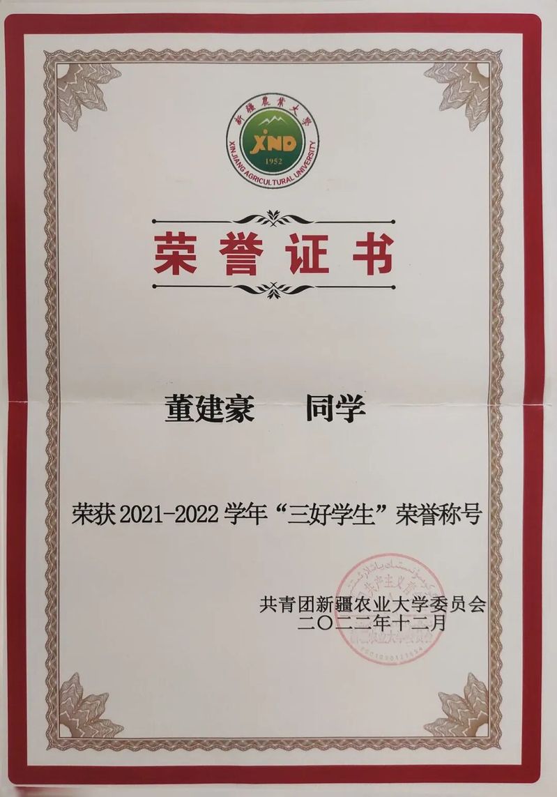 一时的努力或许并不难,难的是持之以恒、坚持不懈。道阻且长,行则将至,行而不辍,未来可期。沉潜三年,等来一场秋风眷顾,在本学期,董建豪同学以其扎实的专业知识、出色的科研能力以及不懈的努力成功获得了新疆农业大学的保研资格,董建豪从众多优秀学子中脱颖而出,未来,她将带着对知识的渴望和对学术的追求,在新疆农业大学这片充满机遇与挑战的土地上,继续深耕细作,向着更高的学术山峰攀登,为农业领域的发展贡献自己的智慧和力量,书写属于自己的辉煌篇章。董建豪同学用行动证明,优秀不是偶然,而是日复一日的坚守与付出。
