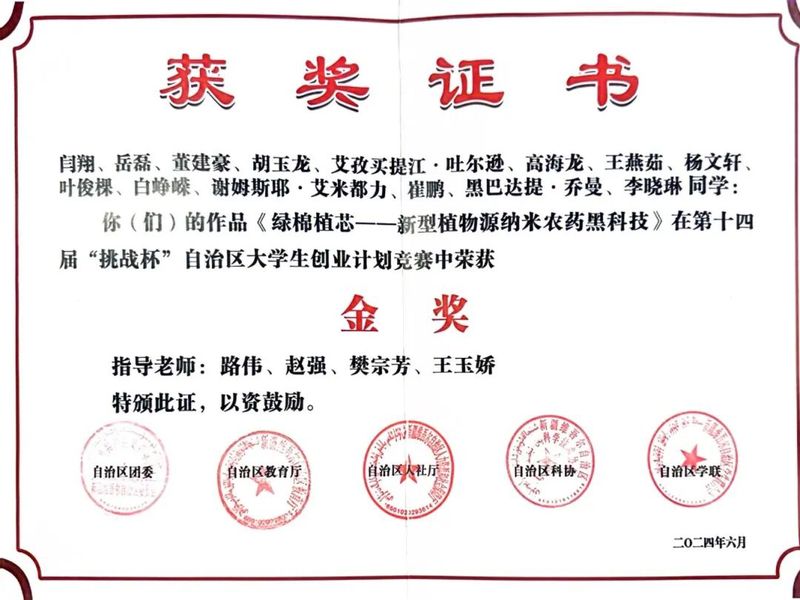 为更好得应用学科专业知识,提升自己的学术能力,董建豪积极参加大学生创新项目,在优秀导师、师兄师姐们的带领下,从基础的文献查阅开始,逐步提升自己的科研能力,对实验流程由懵懂无知到熟悉精通。大二学年,董建豪以负责人身份主持大学生项目一项《川楝素对斜纹夜蛾的杀虫活性研究》,项目成果目前以第二作者发表论文《茶皂素混配川楝素和印楝素对斜纹夜蛾拒食活性的增效作用》。在实验过程中也激发了她对科研的兴趣,在老师的指导以及师兄师姐们的帮扶下、董建豪开始探索各个领域,于全国大学生生命科学竞赛中《宽缨酮对棉铃虫生长发育作用机理的研究》获自治区选拔赛三等奖。而在十四届“挑战杯”自治区大学生创业计划赛、十四届全国大学生电子商务“创新、创意及创业”挑战赛新疆农业大学选拔赛、全国大学生创新大赛(2024)自治区选拔赛的参赛过程,由董建豪展示课题组成员将理论化为实践的成果,这也让董建豪更乐于躬身实践。