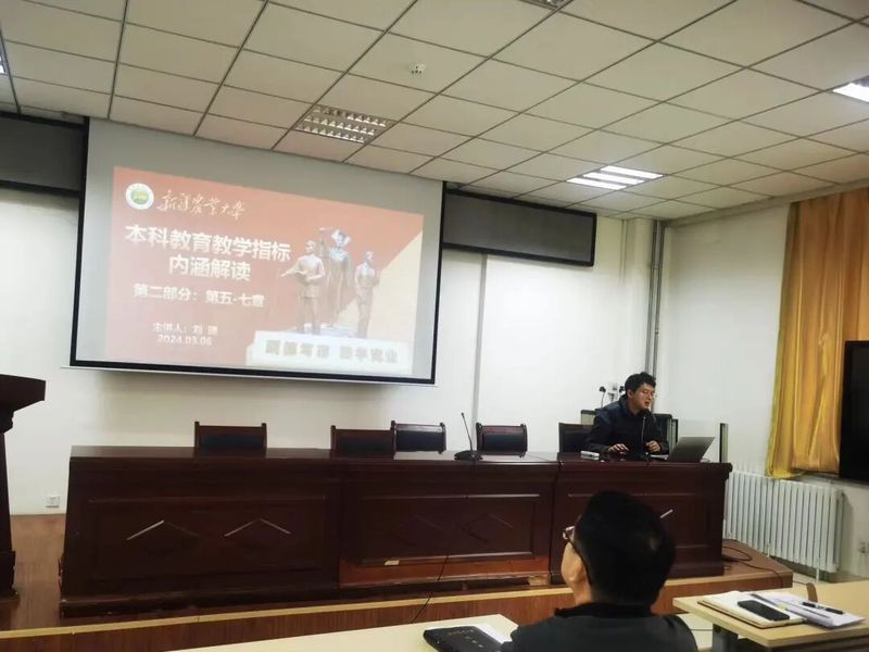 于月华和刘琦为参会教师解读本科教育教学指标内涵。于月华提到,以为人民服务、为中国共产党治国理政服务、为巩固和发展中国特色社会主义制度服务、为改革开放和社会主义现代化建设服务的社会主义办学方向,形成专业课教学与思想政治理论课教学紧密结合、同向同行的育人格局。